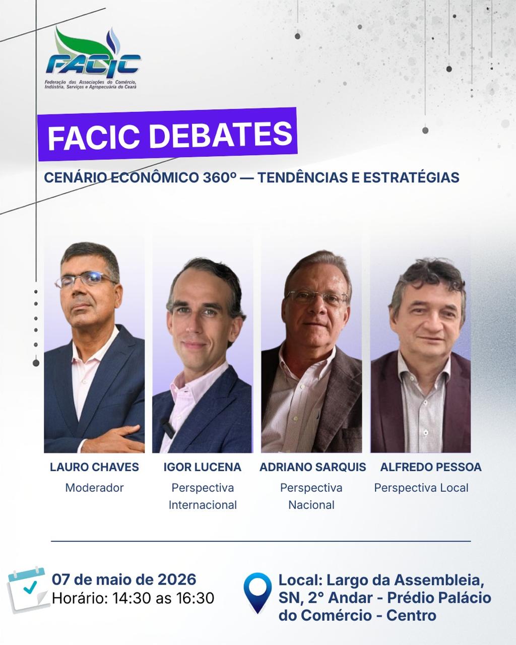 O presidente Cid Alves e diretores convidam para o FACIC Debates: Cenário Econômico 360º — Tendências e Estratégias, que será realizado no dia 07 de maio de 2026, 14h30, no Palácio do Comércio – sede da FACIC.