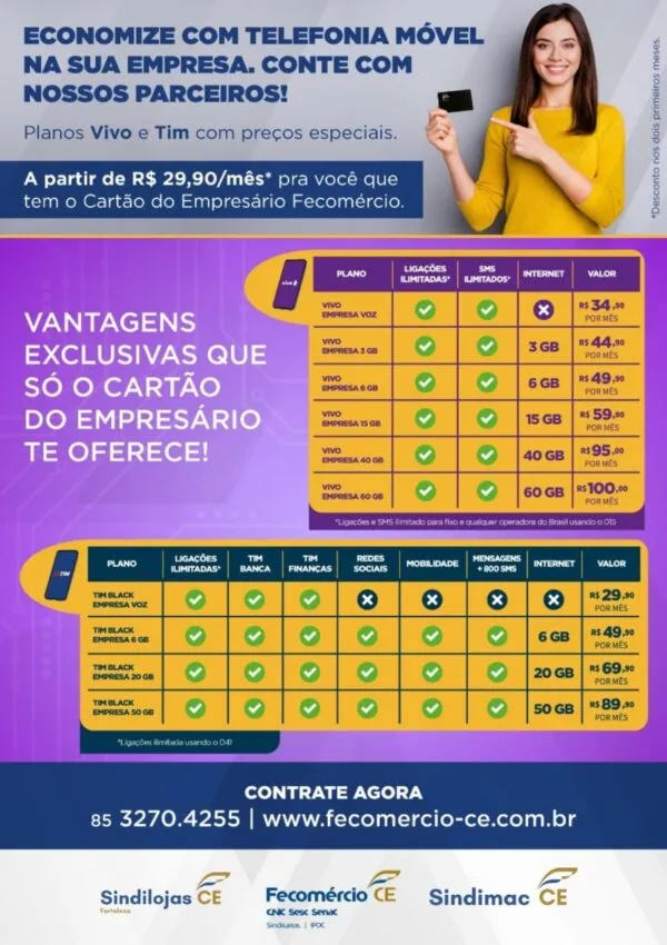 O SINDILOJAS Fortaleza em parceria com a FECOMÉRCIO-CE disponibiliza aos seus associados, serviços de telefonias móveis (VIVO e TIM), com descontos diferenciados. Veja abaixo o melhor plano para você ou sua empresa e faça já o seu!